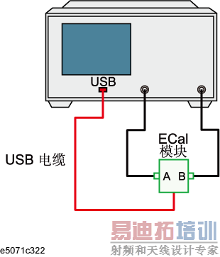 通过 USB 电缆将 ECal 模块上的 USB 端口与 E5071C 上的 USB 端口相连接。可以在 E5071C 的电源接通时进行此连接。
