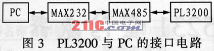 本文主机A、B都采用PC。PL3200带有1个RS-485串行口,而PC一般只有2个RS-232串行口。为了实现普通PC与PL3200的连接,本文设计了一个接口电路,如图3所示。图中,MAX232是+5V电源的收发器,与计算机串口连接,实现RS-232接口信号和TTL,信号的电平转换。MAX485用来实现TTL与RS-485的电平转换。也可以采用工业控制计算机作为主机。工业控制计算机本身带有RS-485接口,可直接与PL3200连接,但工业控制计算机的价格要比普通PC高得多。