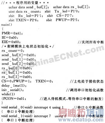 单片机上电后,首先对系统和串口进行初始化,然后单片机进入待机模式,直到两个串口中的一个发生中断硬转为工作模式,处理中断程序。主要的程序代码如下: