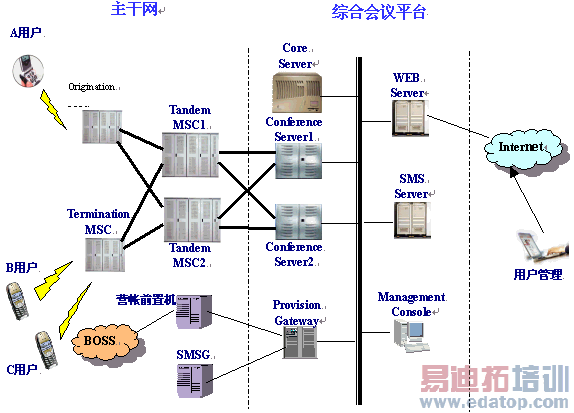 Conference Server 系统的信令接续、呼叫控制、会议控制及语音处理单元。它与MSC以ISUP或TUP信令对接,负责接听、应答来自MSC的来话并建立语音通道,或发起呼叫至被叫。会议的发起、桥接、结束,会议资源的分配等。