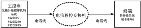 架远程升级整个系统包括主控端和终端,主控端负责发送数据;终端在接收数据后,通过ISP的方式自我更新程序存储空间。主控端由 W925EP01/W925E240/W925E625 搭建的系统,或其他带有CID发送的系统来完成。终端由W925EP01搭建。主控端和终端之间的通讯仅通过电话线完成,整个系统构架如下:
