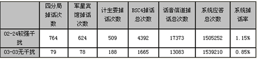 图4分别列出了从2月1日到3月8日每天六个忙时的TCH掉话总次数、系统应答总次数、系统掉话率。2月21日到27日掉话率突然恶化是受安全厅会场干扰仪影响。