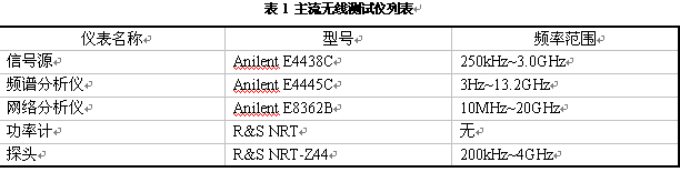 该系统所采用的测试仪表主要有:频谱分析仪、网络分析仪、信号源和功率计。第二代、第二代半和第三代移动通信终端设备检测和基站设备检测系统的测试频率范围应满足400MHz~2600MHz.。杂散发射测试范围应高于12.75GHz。 综合考虑目前主流的无线综合测试仪各自的优势,系统所采用仪表见表1。