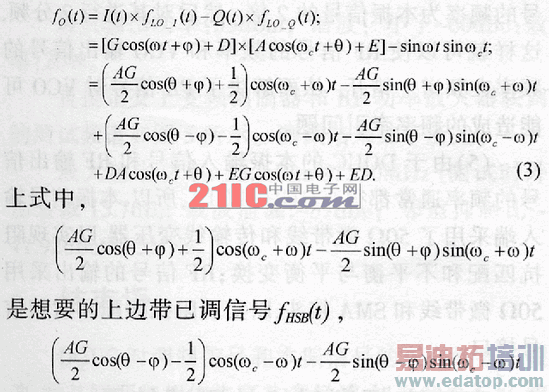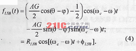 是泄漏的下边带无用信号fLSB(t),Dacos(ωct+θ)是泄漏的本振信号,Egcos(ωt+θ)+是输出的低频分量,通过BPF滤除。显然,fRF(t)主要包括fHSB(t)、fLSB(t)和Dacos(ωct+θ)。下面着重对边带与本振泄漏问题进行讨论。