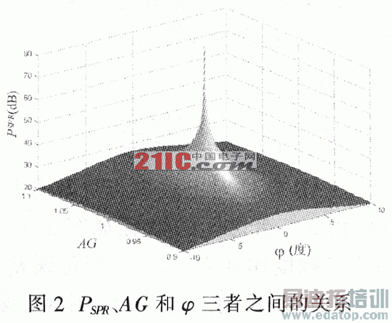 在实际电路中,AG的调节较为方便,通过严格地调制可以使AG→1。但由于现有集成电路工艺水平的限制和电路布线、布局的影响,把正交相位误差限制在±2°以内已非常困难。即在实际电路优化设计时,保证PSPR≥35dB比较困难。