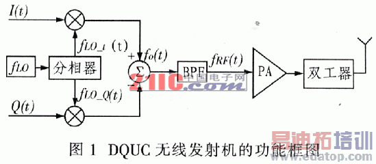 典型的DQUC无线发射机的功能框图如图1所示,其中I(t)和Q(t)是正交基带调制信号,fLO是射频本振信号,fRF(t)是已调射频信号。电路工作时,fLO先经分相器移相产生正交本振信号fLO_I(t)和fLO_Q(t),然后分别与正交基带信号I(t)和Q(t)相乘后作代数(加或减)运算,低消无用边带信号,输出想要的边带信号fRF(t),从而实现单边带调制。
