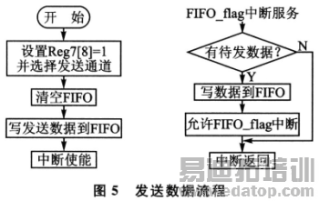 发送数据流程如图5所示。在发射数据时,先设置Reg7的第8位为1,允许在内部状态机控制下进入数据发射状态,再设置Reg7的O~6位为所选通道。在发送前导尾区数据前,MSP430F247必须将数据放人FIFO中,如果数据长度超过63字节,应该分多次写入。FIFO_flag=1表示FIFO为空,MSP430F247利用此信号作为中断请求,保证发送数据写入FIF0的实时性,在数据发送完成后PKT_flag=1。