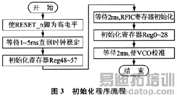 系统上电后,先使EMl98810的RESET_n引脚为低电平,以保证芯片有效复位;再使此引脚为高电平,BRCLK脚会产生12 MHz的时钟;然后进行相关寄存器初始化。初始化程序流程如图3所示。