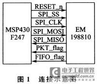 图1是MSP430F247单片机和EMl98810的连接示意图,通过SPI总线与RF芯片相连。实际电路连接如图2所示。