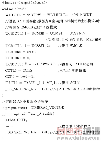 MSP430F247通过SPI接口与EMl98810相连,进入LPM3模式和退出LPM3模式的程序如下: