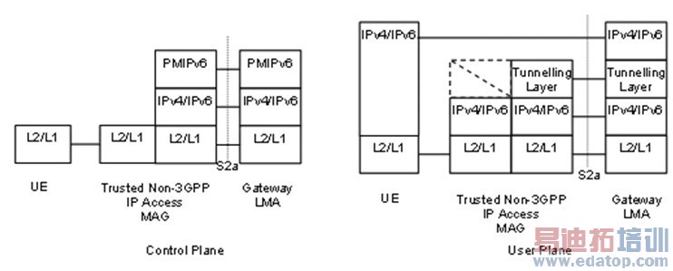 在以上接入点中,S2a是最主要的接入点,是数据传输的接口,不同网络的分组需要在该接入点处进行处理,符合外部网络的特性。因此其协议栈的设计对于数据的传输十分重要。