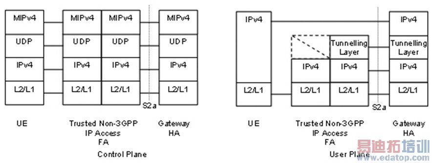 S2a协议栈对于PMIPv6和MIPv4稍有不同,对于PMIPv6,终结控制面和用户面的功能实体是non-3GPP IP access(WiMAX)的MAG(移动接入网关)和网关中的LMA(本地移动锚点),这里LMA包括本地代理的功能。控制面的协议栈是基于IPv6/IPv4的PMIPv6,用户面的协议栈是基于IPv4/v6转发分组。而对于MIPv4,终结控制和用户面的功能实体是UE中的MN和non-3GPP IP access(WiMAX)的FA,以及网关中的HA。控制面协议栈是MIPv4,用户面在IPv4传输层转发IPv4分组。