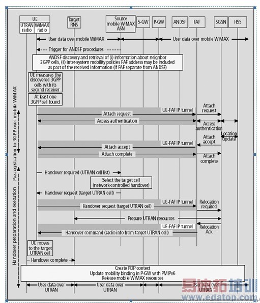 TD-LTE与WiMAX的切换流程如上图所示。UE通过ANDSF/FAF得到LTE邻区信息,以及系统间的移动策略。UE接着测量LTE邻区,如果UE决定发起切换,UE将发起预先注册过程,预先注册过程是典型的3GPP attach过程,虽然UE在WiMAX网络中,但是可以通过UE和FAF之间的IP隧道进行。注册过程由UE发送给FAF的Attach Request信息激活,FAF将Attach Request信息通过普通的Iu-PS接口发送给SGSN,它将发出普通的LTE认证过程,如果认证成功,SGSN将接收attach请求,并发送Attach Accept信息,同时更新UE在HSS中的位置信息。