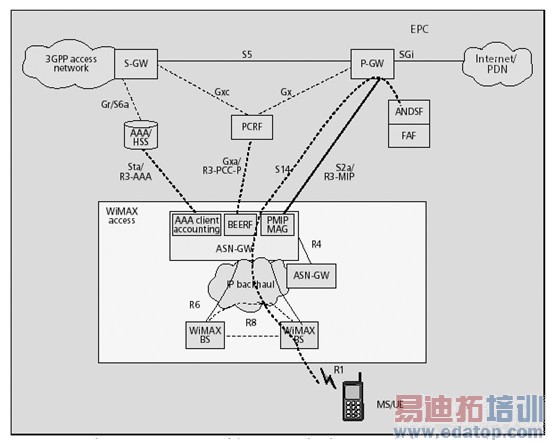 从上述过程可以看到,TD-LTE可以让终端通过AAA服务器,WiMAX ASN-GW和P-GW之间的PMIP接口(S2a)接入到核心网中。并且,PCC可以对用户业务提供动态策略和计费规则。