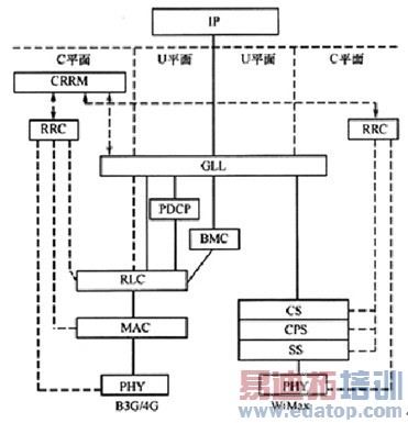 下图给出了采用GLL后的WiMAX与LTE-Advanced网络融合参考协议架构。其中:PDCP表示分组汇聚协议;BMC表示广播、多播控制协议;CS表示汇聚子层;CPS表示通用部分子层;SS表示加密子层。该协议架构是基于一种紧耦合的方式,GLL放在原有协议的层2之上,但在层3之下。由于在LTE中,控制与数据层面已经分离,GLL分别定义了控制平面(GLL-C)和用户平面(GLL-U)。在用户平面,基于不同网络的不同格式MAC数据通过GLL-U层处理,提供给上层一个统一格式定义的数据流。在控制层面,GLL-C将各网络的下层反馈信息收集,并传递到协同资源管理单元,以进行动态的资源管理。