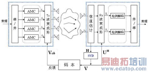 以上两种方案的发射端都不需要信道信息(CSI),称之为开环MIMO系统。在信道变化较慢的场合,如大城市的室内环境和游牧式的接入服务,闭环MIMO系统能够进一步提升系统性能。闭环MIMO系统是接收端将信道信息反馈给发射端,然后对传输数据进行预编码、波束成型或者天线选择等操作。闭环MIMO的反馈方式又可以分为全反馈和部分反馈等。全反馈是将全部信道信息反馈给发射端,由于反馈链路要占用系统开销,在实际系统中,一般都采用部分反馈技术。例如反馈信道的统计特征值、SVD分解值、基于码本的码字序号等,实现性能和复杂度的权衡。