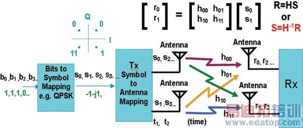STC会以稍微不同的编码方式,传送每一个符号码(symbol)的数据两次,让接收器有两次机会可以接收数据。如图1右上角的方程式所示,如果接收器具有信道(h0和h1)的相关讯息,就可以解出传送过来的符号码s0和s1。通道是依据导频(pilot)量测结果所估测出来的。
