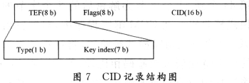 算法模块的应用方法主要根据TEK(传输加密密钥)和CID(连接标志)的对应关系设计。在802.16协议中每一个CID都对应惟一的密钥资源,因此可以根据CID找到对应的密钥。在系统中创建两个表,一个是TEK表:用于存放加密密钥;另一个是CID表:用于存放CID值和对应密钥索引。CID表中记录结构如图7所示。Type字段表示使用的加密方法,O表示DES-CBC,1表示AES-CCM;Key index字段值表示该CID标志对应的密钥信息,在TEK表中的索引位置;CID字段表示CID标志值。