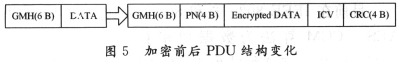 AES-CCM算法中,加密函数使用128 b密钥长度的AES算法。加密前后WiMAX MAC PDU结构变化如图5所示。