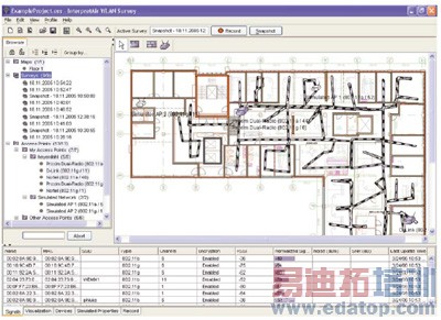 InterpretAir 的图形化用户界面请参见图 2。主窗口显示站点的布局, 一个室内楼面或室外的布置图。浏览器视图左侧列出项目中的地图、勘察和接入点。仅所选的接入点和勘察被用于创建形象化视图——可以选择只显示您的网络、或显示所有网络、或非法接入点的覆盖范围。底部窗格提供附加信息;信号信息实时监测、图标的属性、所连接的设备以及设备的属性,并图表显示信息强度随时间的变化。