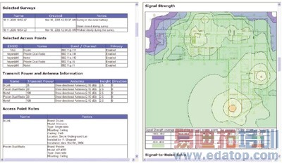 InterpretAir 自动地创建 HTML 报告,包括所有接入点信息、安装说明、接入点位置信息,最重要的是,覆盖范围和性能地图。软件提供可定制报告框架,可以使用几个模板。因此,能够创建完整的、可定制的性能报告;一份给最终用户,另一份更详细的供 IT 部门内部使用。图 5 提供了两个报告样本。