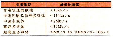 在上表中,非常低速的数据业务类型指的是峰值比特率最高达到16 kb/s的数据业务。其典型的应用是语音业务和简单的消息类业务,另外,传感器通信和低比特率的数据电信测绘业务也属于这种业务类型的应用。低速数据&低速多媒体业务类型指的是峰值比特率低于144 kb/s的数据业务。一般指的是IMT-2000之前的系统的业务应用。中速多媒体业务类型指的是峰值比特率最高达到2Mb/s的数据业务。一般指的是IMT-2000系统的业务应用。高速多媒体业务类型指的是峰值比特率最高达到30Mb/s的数据业务。其典型应用包含多媒体视频流式业务,类似于固定无线接入通信提供的xDSL业务。超高速多媒体业务类型指的是速率非常高的多媒体数据,其典型应用类似于有线通信系统的光纤到户(FTTH)的业务。