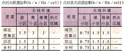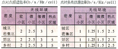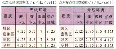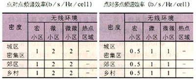 从频谱需求计算中使用的区域的频谱效率(b/s/cell)可以转换得到单位Hz上的频谱需求。RATG1/RATG2的频谱效率根据预测年份的不同而不同,表7~表12分别给出了2010、2015和2020RATG1、RATG2的频谱效率。