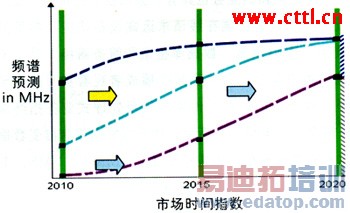 由于全球市场的不平衡发展,图2给出了全球不同的市场的发展趋势和频谱需求的关系的定性描述。一些国家希望尽可能快的实现IMT-Advanced通信系统,其系统的部署如图2中最上面的蓝色曲线描述,此类市场被称为“先进型市场”。也有的国家其IMT-Advanced通信系统会晚于蓝色曲线描述的市场,这种市场的描述如淡蓝色曲线描述,此类市场是中等发展的市场,称为“平均型市场”;还有一些国家其IMT-Advanced通信系统发展很慢,则其市场为最底下的红紫色曲线描述的市场;此类市场称为“后进型市场”。三类市场的划分是基于不同的市场预测情况,最大的不同是在2010和2015年的市场发展情况,因此2010和2015年间的市场趋势用虚线标出。