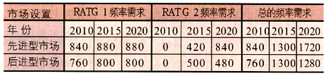 从报告的结果可以看出,到2020年,总和按照两个运营商计算,RATG1和RATG2总的频谱需求范围是1440MHz~1760MHz,最低的频谱需求也要1440MHz。按照我国的业务和市场预测情况,信息产业部电信研究院按照WP8F提出的ITU-R M.[IMT.METH]建议中定义的计算方法计算得出了我国的2020年的频率需求,总的频谱需求为1360MHz。其中RATG1的频谱需求为560MHz,RATG2的频谱需求达到了800MHz。
