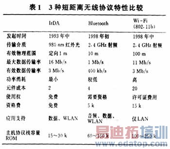 表1列出了以上3种短距离无线通信协议特性的比较。