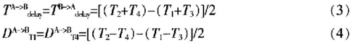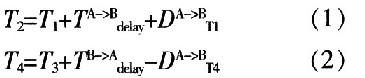 图1中描述了无线HART节点A与节点B间的一次通信,节点A在T1时刻发送一个数据包给节点B,节点B在T2时刻接收到A所发送的数据包,节点B 在T3数据包发送一个应答数据包,节点A在T4时刻接收到B所发送的应答数据包。T1、T2、T3,T4为节点时钟,四者存在以下关系: