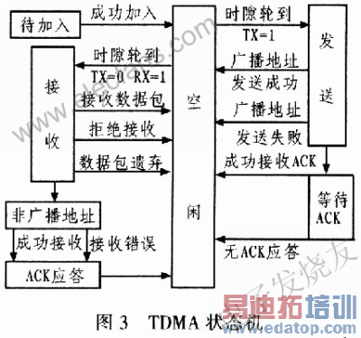 图3为TDMA状态机,该状态机建立在逻辑链路层所建立的四张调度表以及调度机制的基础上,TDMA状态机开始于节点加入无线HART网络,加入的同时建立状态机所需要的超帧表、图表、链路表,开始从邻居节点接收数据并以此为基础建立邻居表。节点维护存储着一列待发送数据包,当一个发送时隙发生,节点将会尝试发送数据包。发送数据包包括发送数据包和接收ACK应答两个过程。当一个发送时隙产生,进入发送状态。成功发送一个广播地址的数据包在数据包发送之后结束,并从等待表中删除。成功发送一个非广播地址的数据包,节点将等待ACK应答数据包,ACK数据包将表明数据包是成功接收还是出现接收错误。如果目的地址是广播地址,将不会有ACK应答数据包,发送完成并进入空闲状态进行调度表的更新;成功发送一个非广播地址数据包,进行数据完整性和权限完整性检验,TDMA状态机进入等待ACK状态,如果无ACK应答表明发送失败。如果是一个共享链接,将启动重发机制,若最终依然失败,进入空闲状态更新调度表。如果一个ACK应答数据包被成功接收,节点根据ACK确定发送是否成功,若发送成功,进入空闲状态更新调度表。如果显示发送错误,将启动重发机制。所有的接收链接都将在没有发送请求的基础被全部服务,节点接收数据有三种可能:1)数据包的目的地址就是节点地址;2)数据包目的地址是路由地址;3)数据包目的地址非以上两种情况。每一次接收数据,邻居表都将被更新维护。