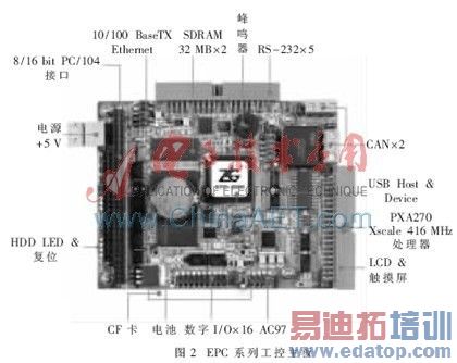 EPC 系列工控主板是广州致远电子有限公司开发的基于ARM处理器的工控机主板,预装正版Microsoft Windows CE 5.0、 Monta Vista Realtime Linux或VxWorks操作系统。如图2所示,EPC系列工控主板板载2路CAN总线控制器、1路 10/100 M自适应以太网适配器、3路RS-232串口,2路RS-485接口,支持TFT/STN液晶屏显示,并具有VGA显示器接口及LVDS液晶接口。EPC系列工控机主板可在-40 ℃~+85 ℃宽温度范围内稳定工作,满足工业级产品的各种应用需求。