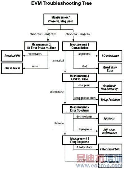 89601A是个功能非常强大的测量分析软件。它可以提供时域、频域、码域和调制域的测量,并提供许多辅助信息帮助调试,如对EVM的测量,除EVM结果外。同时还提供丰富的分析功能帮助分析TD-SCDMA的数字调制信号,精确地定位出导致信号EVM恶化的原因。如图3所示,在分析结果中,出EVM和Rho值外,还包括幅度误差、相位误差、频率误差、I/Q偏移等信息。图4给出了利用89601提供的信息进行差错分析的流程。这些测量信息对系统调试和故障定位非常有帮助。