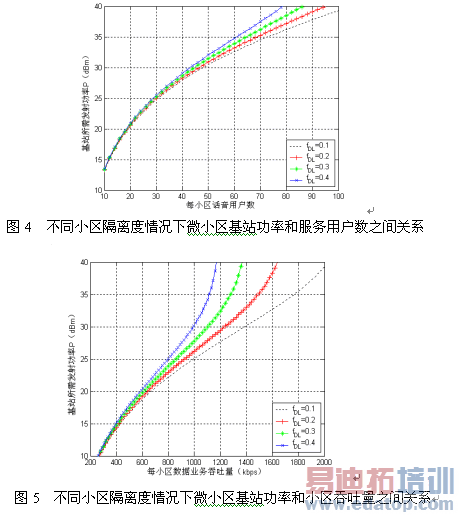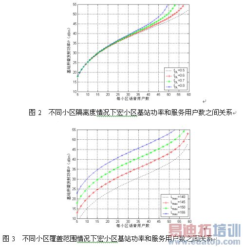 从这两个图可以清楚地得到基站所需功率取决于整个网络的干扰条件和小区的半径,也可以看出如果基站的发射功率相同的话,它既可以考虑用于更大小区的覆盖也可以用于更高的小区负荷。