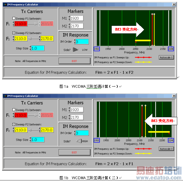 图1a表示了当F1=2110.0MHz,F2从2110.0MHz向2170.0MHz方向变化时,IM3从2050.0向2110.0MHz的变化趋势;图1b表示了当F1=2110.0MHz,F2从2170.0MHz向2110.0MHz方向变化时,IM3从2230.0向2110.0MHz的变化趋势。