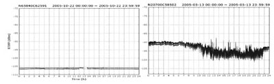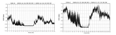 华为公司相关后台软件能够实时跟踪并以图形的形式显示RTWP数据,也可以把跟踪的数据文件通过华为公司自己开发的相关软件进行图形化显示。图1是图形化显示的RTWP跟踪结果,在图1中红色代表这个小区对应的主集,蓝色代表这个小区对应的分集,横坐标表示一天的时间,单位为小时,纵坐标表示RTWP值,单位为dBm。从图1可以看出,图1中左边的小区没有受到干扰,右边的小区受到比较强的干扰。