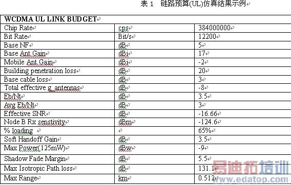 在乡村、公路沿线等低话务密度地区,覆盖是主要问题,由于移动台的发射功率有限,网络覆盖范围受限于上行链路(基站需有功率足够大的功放),而上行链路的小区边界又受上行负载因子的影响;在市区等高话务密度地区,系统容量取决于下行链路的可分配功率,通过分配不同的导频功率,可以控制下行链路的覆盖范围。需要特别指出的是,在WCDMA中,多径传播已不再成为消极因素,而是理想的结果。因为接收机能将时延至少为1Chip(WCDMA网络数据传输率为3.84Mbit/s,即1Chip=0.26微秒,相当于78米)的信号组合成有效信号。表1为上行链路预算所得的部分结果示例。