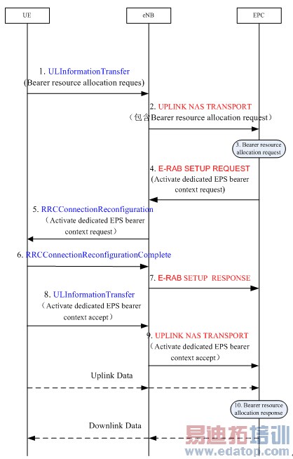 1、N0010 连接状态下的UE通过ULinformationTransfer 消息将Bearer resource allocationRequest 消息传递给eNB。(也可以是发送Bearer resource modificationrequest消息)