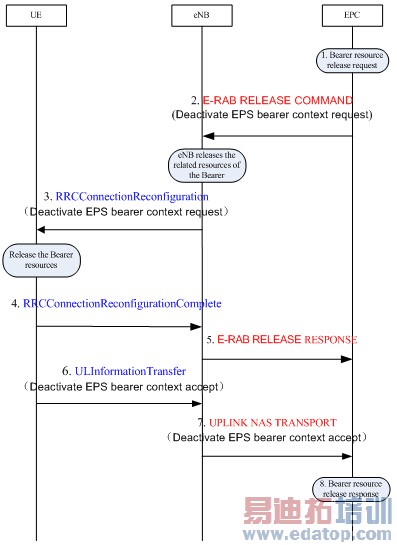 4、N0040 UE收到重配消息RRCConnectionReconfiguration中的NAS消息(Deactivate EPS Bearer Context Request)后释放相关承载资源。