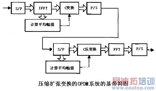 因此给出一种改进的压缩扩张变换方法。在这种方法中,把大功率发射信号压缩,而把小功率信号进行放大,从而可以使得发射信号的平均功率相对保持不变。这样不但可以减小系统的PAPR,而且还可以使得小功率信号抗干扰的能力有所增强。μ律压缩扩张方法可以用于这种方法中,在发射端对信号实施压缩扩张操作,而在接收端要实施逆操作,恢复原始数据信号。压缩扩张变化的OFDM系统基带简图如下所示: