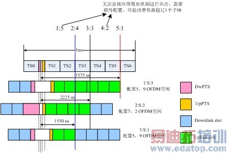 对于TD-SCDMA的时隙比例1:5和4:2,TD-LTE无法通过简单的特殊子帧配置获得与TD-SCDMA的共存,可以考虑打掉一个子帧(1ms)的方式进行共存,资源浪费超过1个子帧。