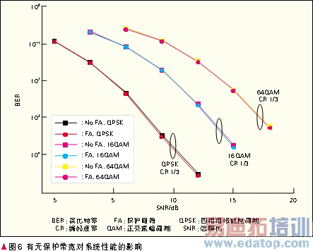 由图6看出,保护带宽对系统的信噪比(SNR)-误比特率(BER)曲线影响不大。只有在高信噪比时,没有保护带宽会造成误比特率的轻微上升。这与DoCoMo公司在加性白噪声(AWGN)信道下的评估结论一致[7]。如果取消连续载波段之间的保护间隔对系统性能的影响不会很大。