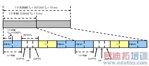 每个10ms无线帧包括2个长度为5ms的半帧,每个半帧由4个数据子帧和1个特殊子帧组成。特殊子帧包括3个特殊时隙:G DwPTS,P和UpPTS,总长度为1ms。