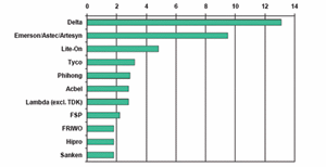 据2007年在美国举办的APEC(应用功率电子会议)会议给出的有关数据指出,全球电源市场按品牌划分如图1所示(资料来源:2007APEC会议IMS调研机构给出的有关数据(2005年全球电源市场按品牌所占的市场份额%划分))。