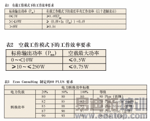美国能源之星对电源有载、空载工作模式下的工作效率和Ecos Consulting制定的80 Plus有关工作效率要求分别如表1、表2和表3所示。