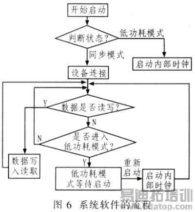 系统软件设计流程如同6所示。由于遵循USB协议,在一段时间不进行任何操作时则进入低功耗模式。而USB3300也拥有这一特性。在一定时间系统不进行任何的读写操作,USB3300将进入低功耗模式,此时USB3300会自动关闭锁相环时钟输出。