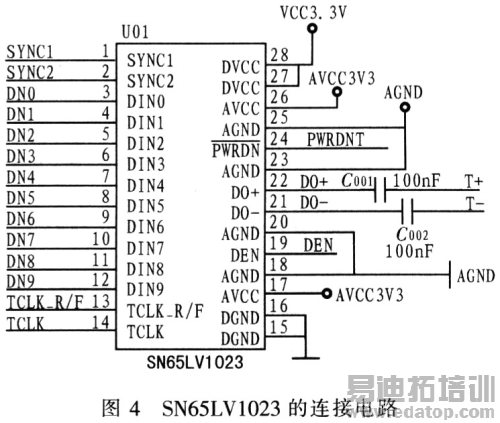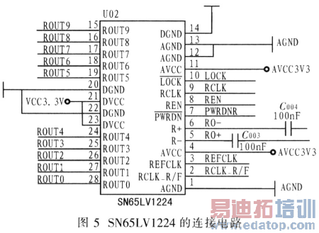 低压差分信号LVDS(Low Voltage Differential Signaling)接口是一种高速数据传输的物理层接口,其电压信号摆幅低,技术上能做到且产生极低噪声,功耗也极低,主要用于服务器、可堆垒集线器、无线基站、3FG交换机及高分辨率显示等。与USB协议接口类似其物理层信号直接与FPGA进行交互相当复杂,系统选用SN65LV1224和 SNLV1023,将FPGA与LVDS接口物理层数据交互,转换为10位的并行信号,同时通过相关的控制信号控制数据的传输方向。SN65LV1023 与SN65LV1224的硬件连接电路分别如图4和图5所示,其中SN65LV1023实现10位并行数据转换成LVDS的低压差分信号,同时FPGA通过TCLK_R/F控制内部锁相环,进而控制SN65LV1023状态。而SN65LV1224则将LVDS的低压差分信号转换成10位并行数据信号输入 FPGA,这样通过SN65LV1023与SN65LV1224,便在较为简单的情况下实现FPGA与LVDS接口的数据交互。