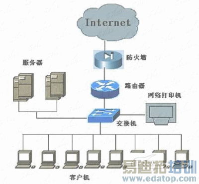 上图所示的仅是一个最基本的星形以太网架构,实际的星形企业网络比这可能要复杂许多。这复性不仅表现在网络设备如何高档,配置如何复杂,更重要的是表现在网络交换层次比较复杂。企业网络中的路由器和防火墙通常只需配备一个,但交换机通常不会只是一个(除了只有20个用户左右的小型网络)。如果用户数比较多,如上百个,甚至上千个,就必须依靠交换机的级联或者堆栈扩展连接了。但级联技术和堆栈技术也有所不同,它们的应用范围也不同。