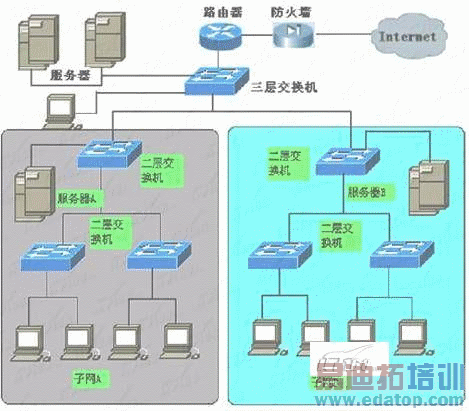 大家都知道,路由器可以连接企业局域网和广域网(如因特网),但却忽略了一路由器的另一个应用,那就是它的局域网连接功能。路由器的广域网连接可参见拓扑图图和三层交换机的路由连接图。